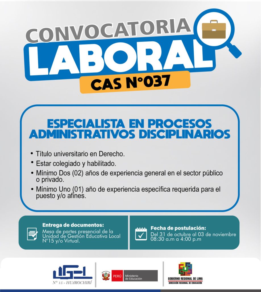 - PROCESO CAS N° 0051-2023-UGEL 15 HRI CONVOCATORIA PARA LA CONTRATACIÓN ADMINISTRATIVA DE SERVICIOS DE PERSONAL (01) APOYO ADMINISTRATIVO EN IMAGEN INSTITUCIONAL.